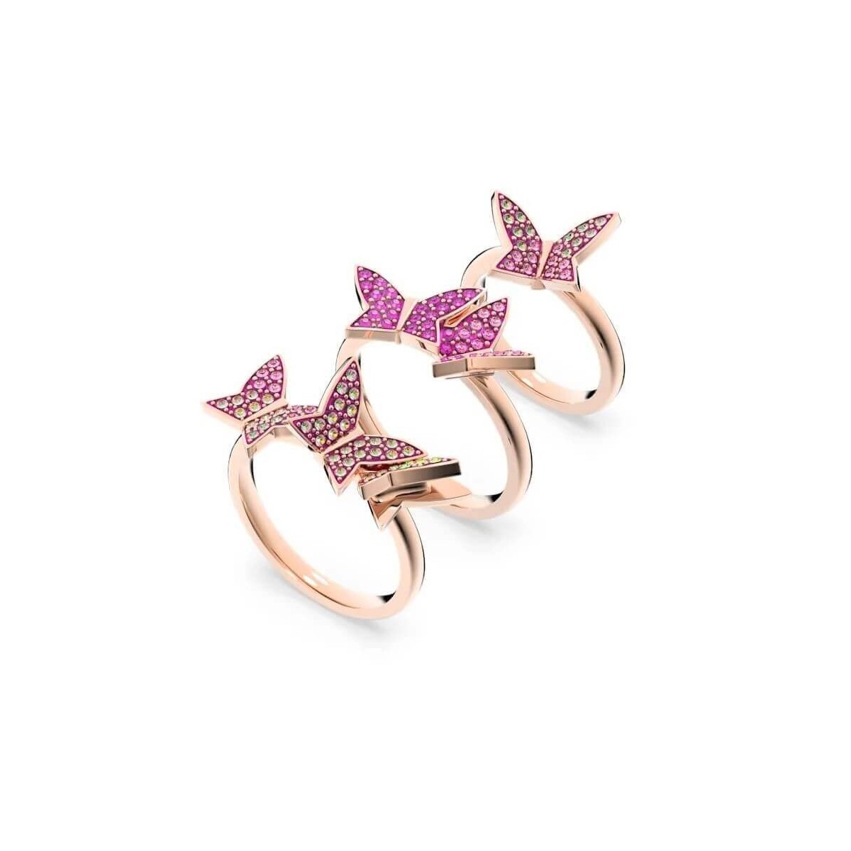 Set bestehend aus drei Swarosvki-Ringen aus der Lilia-Kollektion aus rosévergoldetem Metall und kleinen Schmetterlingen, die mit fuchsiafarbenem Kristallpavé verziert sind. Größe 55