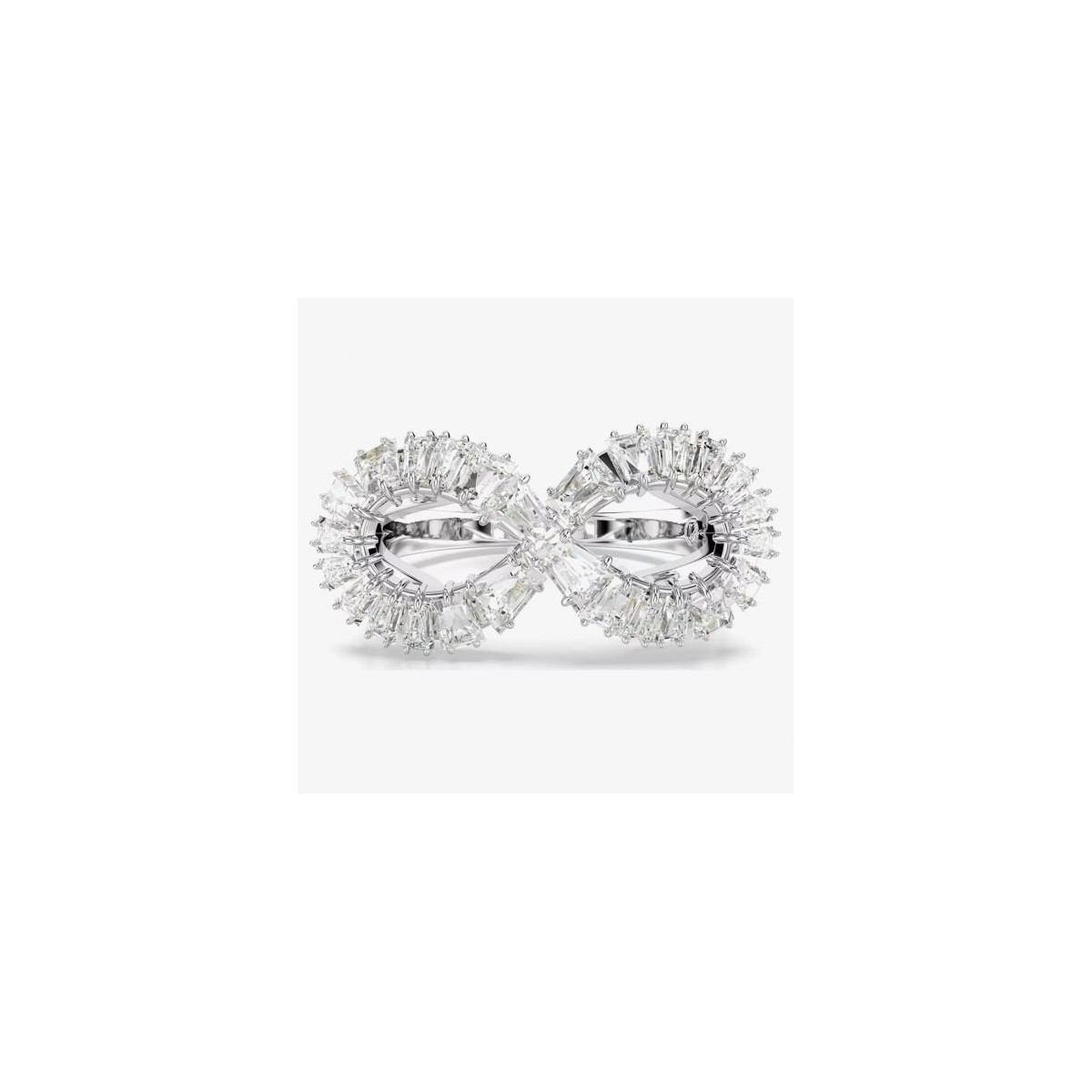Swarovski-Damenring aus der Hyperbola-Kollektion, hergestellt mit Rhodinierung. Das Schmuckstück verfügt über ein unendliches zentrales Motiv, das fachmännisch aus weißen Swarovski-Zirkonia zusammengesetzt ist und dem Schmuckstück einen leuchtenden Effekt verleiht.