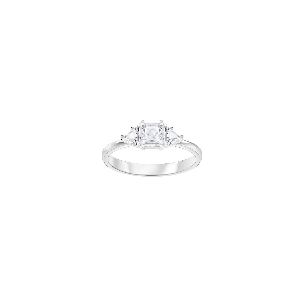 Frauenring, Trilogie-Modell, mit asymmetrischer bis weißer Kristalleinbettung auf glattem Rhodium-Schaft, Größe 58