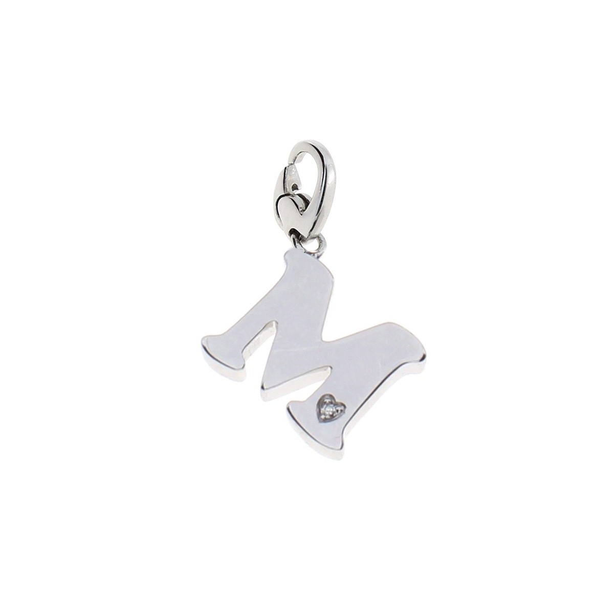 Silberanhänger mit Naturdiamant in Form eines kleinen Herzens aus der Kollektion CHARMS OF LOVE, Buchstabe M mit Gravurmöglichkeit und Karabinerhaken