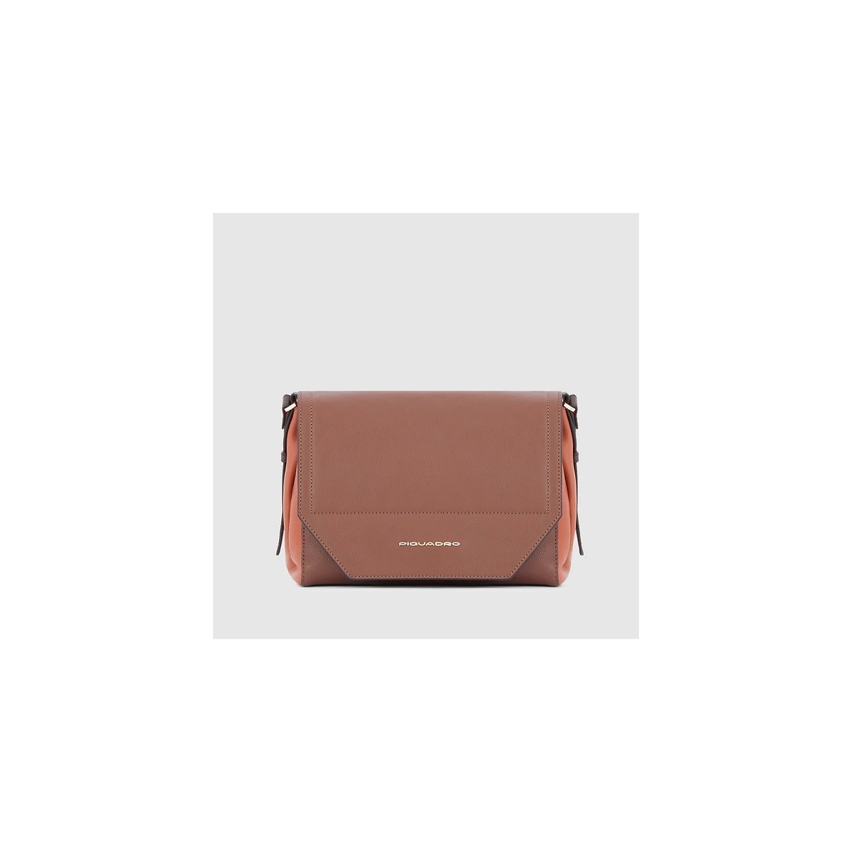 Damen-iPad-Minitasche von Piquadro aus der Circle-Kollektion, aus braunem und orangefarbenem Leder an den Seiten, mit fester Innenorganisation und Stoßschutz. Verstellbarer Schultergurt.