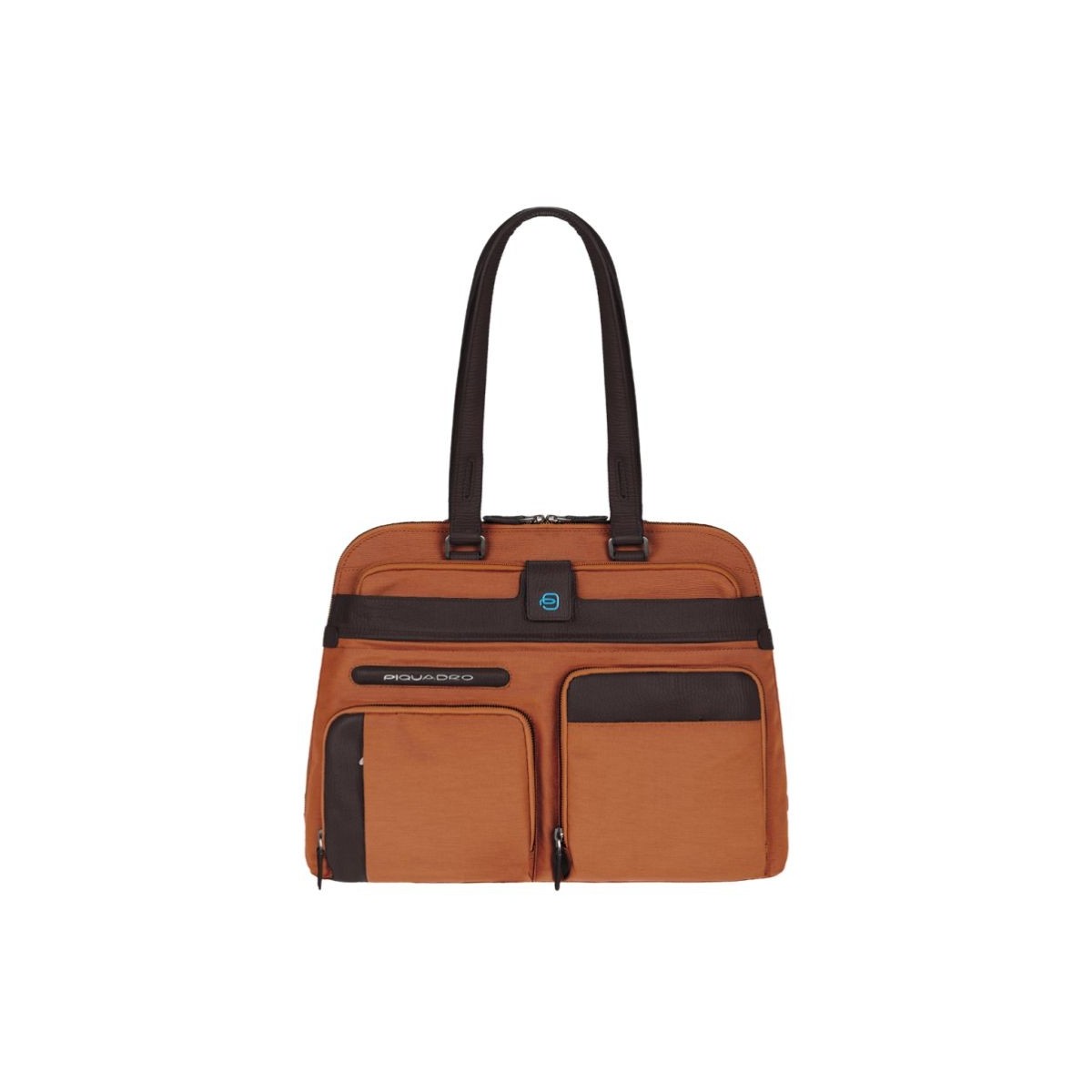 Frau shopping Tasche zwei Ledergriffen braun und orange und braun Stoff