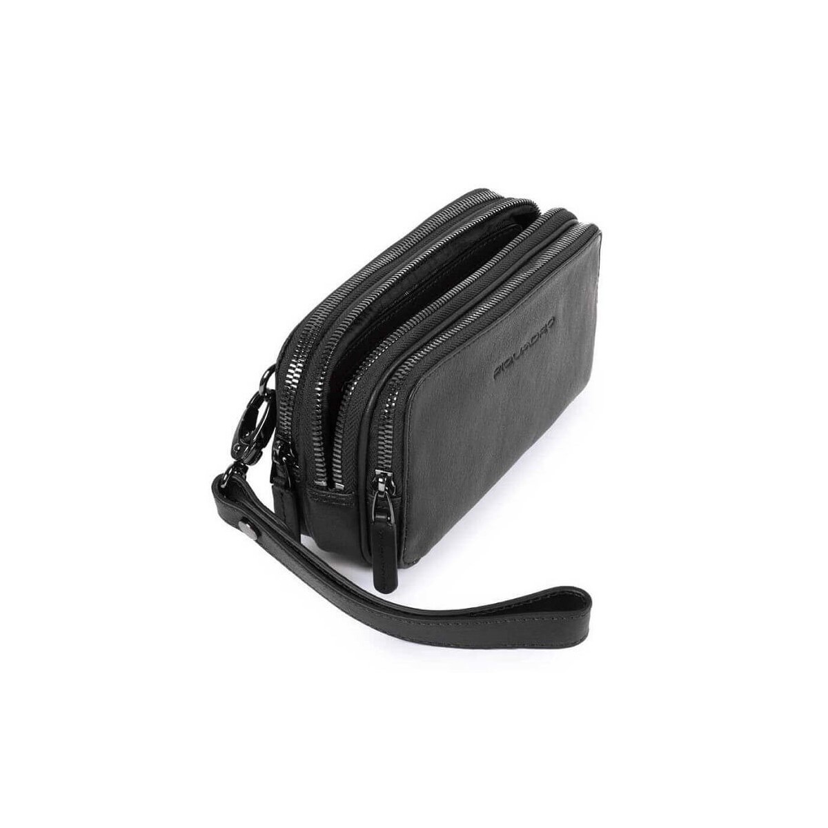 Handtaschen-Etui aus schwarzem Leder mit 3 separaten Fächern, die durch drei Reißverschlüsse geschlossen werden