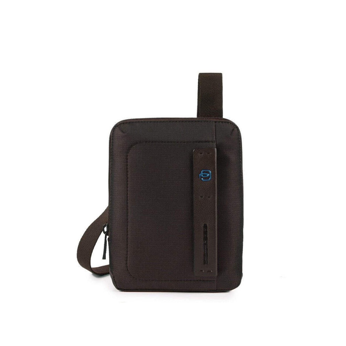 Herrentasche aus der Piquadro P16-Serie aus dunkelbraunem Stoff und organisiert mit Mini-Ipad-Fach und festem Objekthalter.