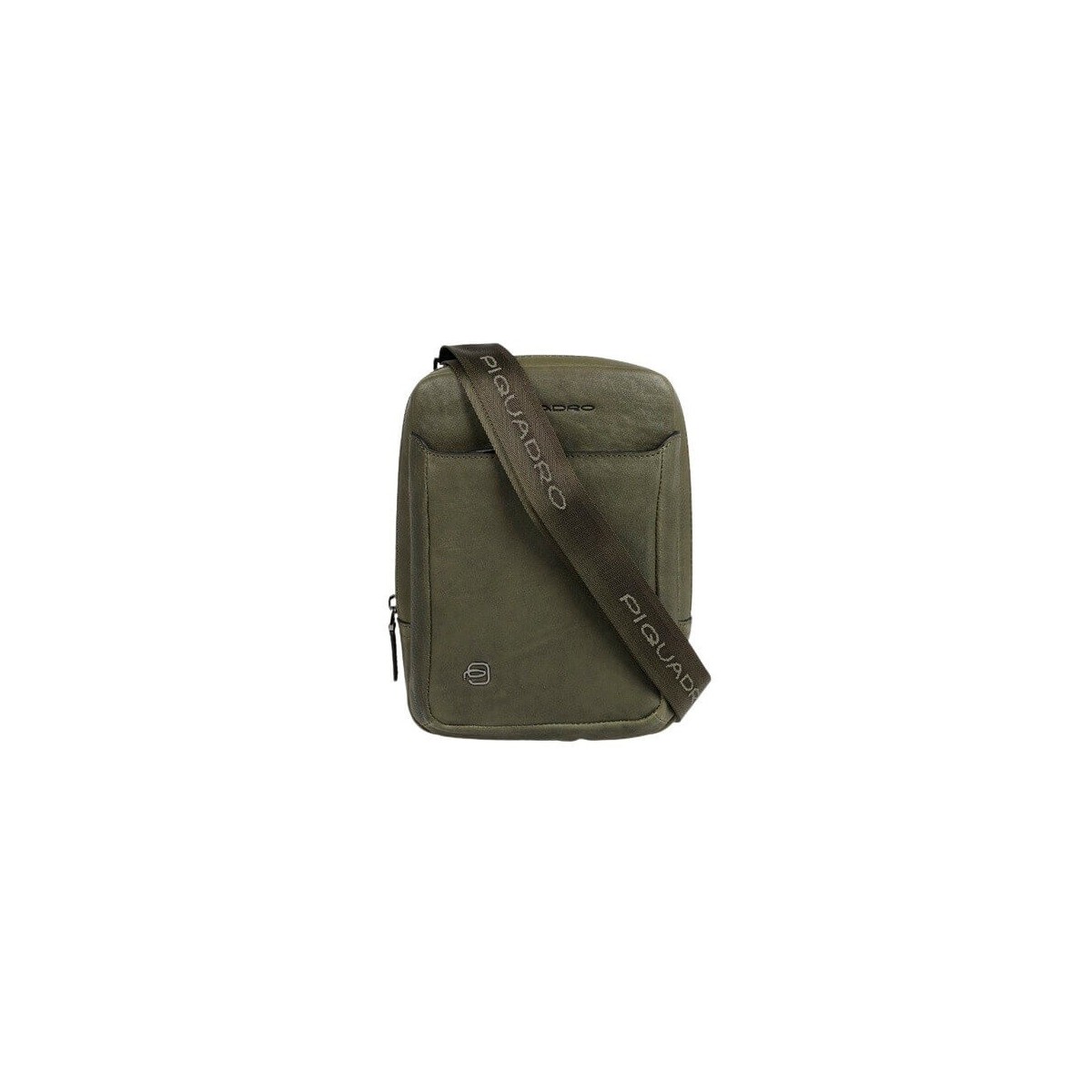Piquadro Herren-Umhängetasche aus der Black Square-Kollektion aus echtem militärgrünem Leder mit dünner Narbung und weicher Haptik mit kleinen Metalleinsätzen. Die Tasche verfügt über eine feste Innenorganisation mit Mini-iPad-Halter, Handyhalter und Stifthalter. Reißverschluss und verstellbarer Schulterriemen aus Stoff.