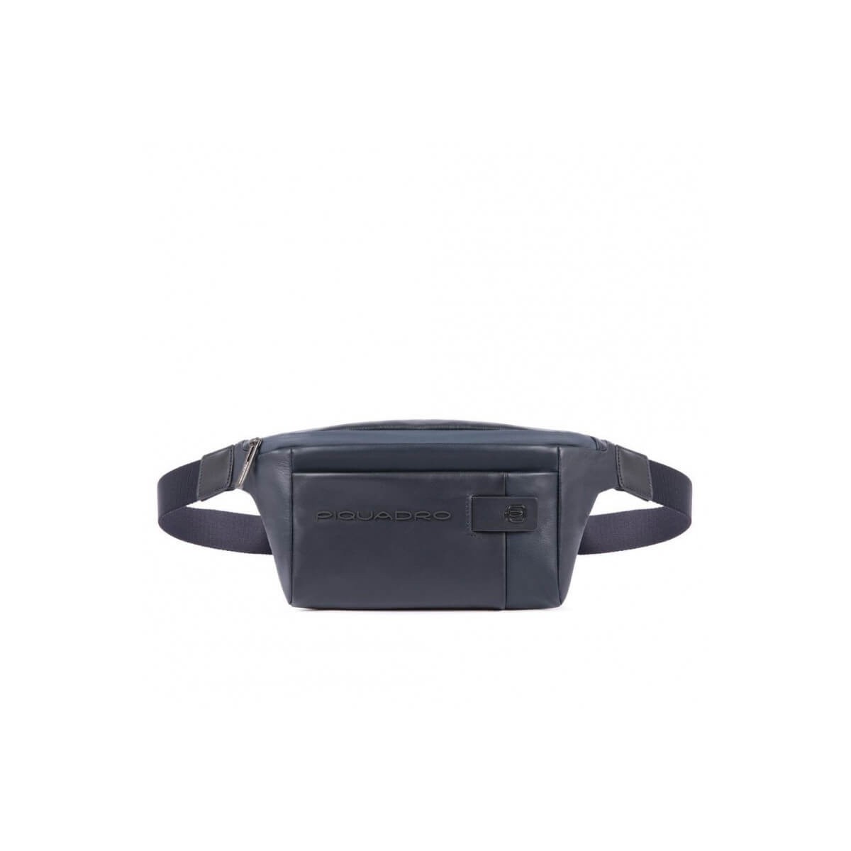 Piquadro Herren-Gürteltasche aus der Urban-Kollektion aus blauem Rindsleder mit feiner Narbung und weichem Griff. Die Babytrage zeichnet sich durch ein einzelnes Fach mit einer breiten festen Innenorganisation aus. Der Mehrwert dieses Zubehörs ist die Kopfhörerschlaufe. Verstellbarer Gürtel