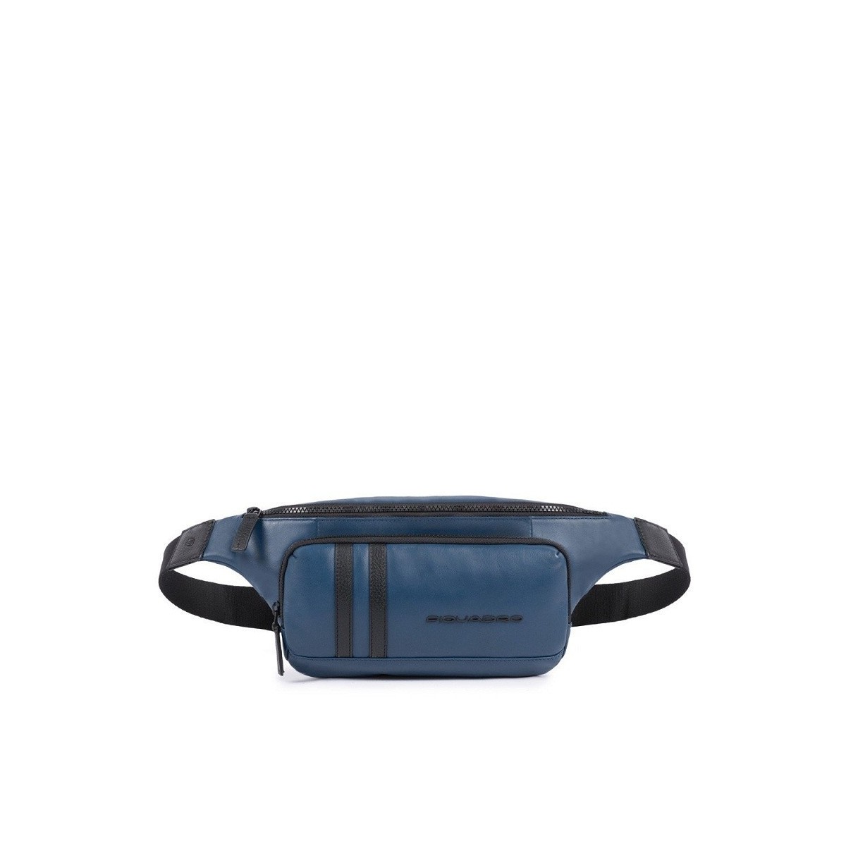 Herren-Gürteltasche aus der Usie-Kollektion aus blauem Leder mit Details und schwarzen Einsätzen. Die Usie-Kollektion besteht aus vollnarbigem Kalbsleder mit weichem Griff und seidenmattem Look, das sich durch schwarze Lederprofile für Schwarz, Blau und Rot auszeichnet. Details wie die schwarze Mikroinjektionsmarke, Druckguss-Reißverschlüsse und Grafiken mit Ledereinsätzen machen diese Linie informell und jugendlich.