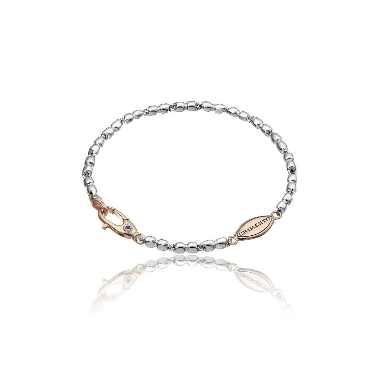 Chimento Herrenarmband aus 925er Silber mit Kette aus kleinen Nuggets und kleiner Medaille mit eingraviertem Logo in Rosésilber. Karabinerverschluss aus roségoldfarbenem Silber, verziert mit einem natürlichen Saphir im Rundschliff von 0,02 Karat.