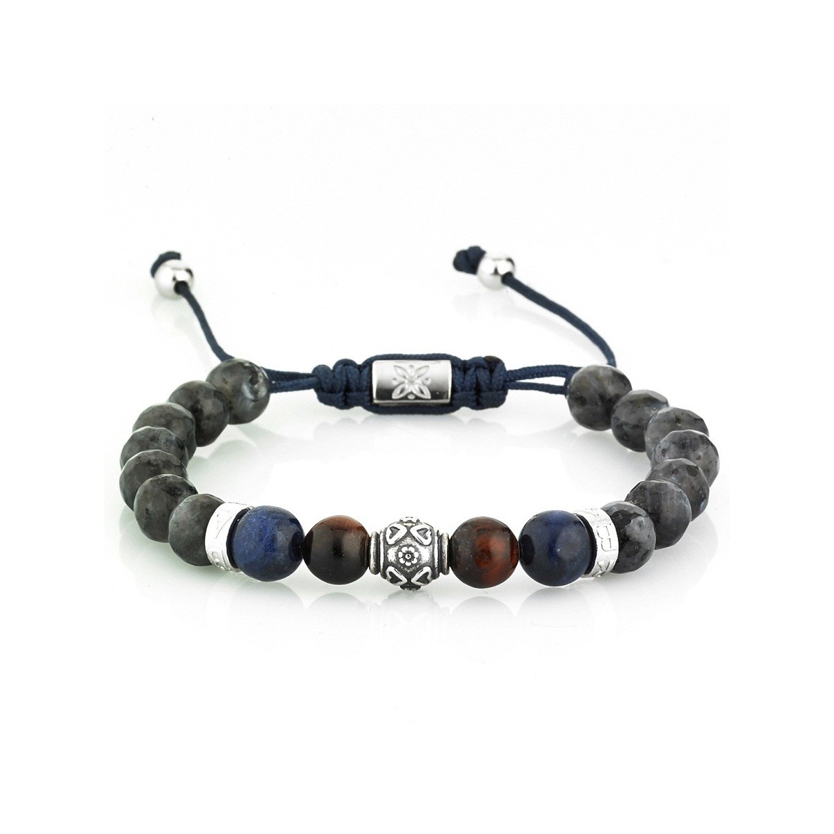 Handgemachtes Macrame-Perlenarmband mit facettierten Labradorit-Steinen, Tigerauge, Sodalit, Logo und Silber 925 Silber.