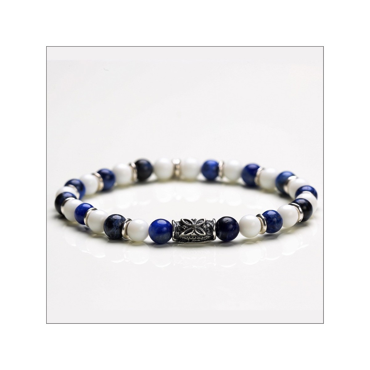Elastisches Armband aus Sodalit-Steinen und weißen Toren und Komponenten aus 925er Silber.