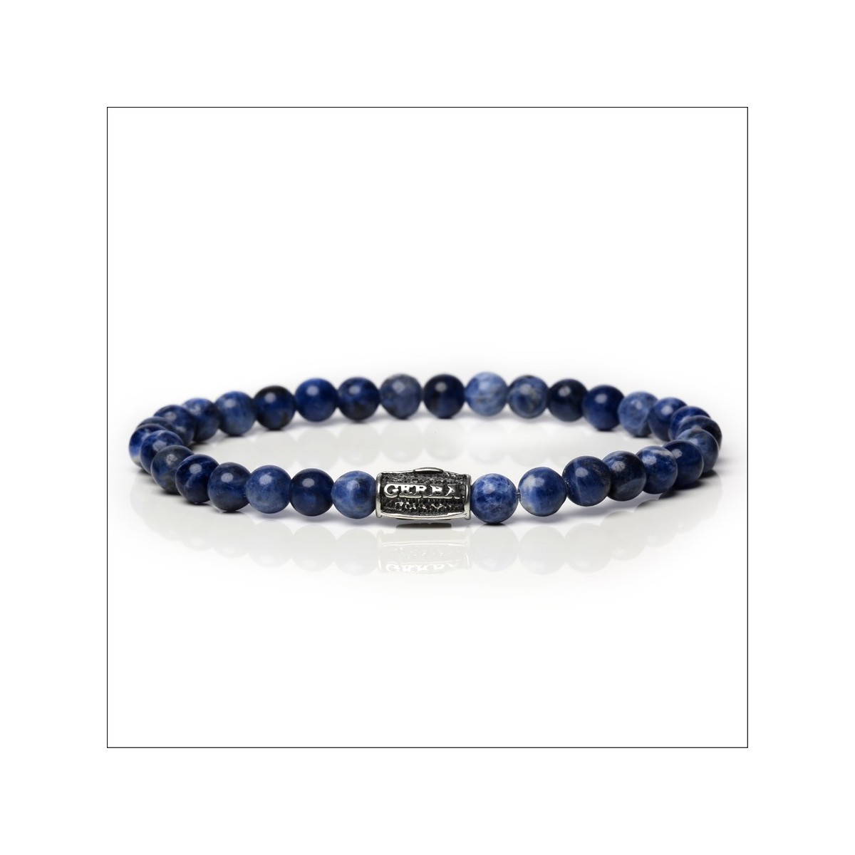 Elastisches Armband aus Sodalit-Steinen und Details aus 925er Silber.