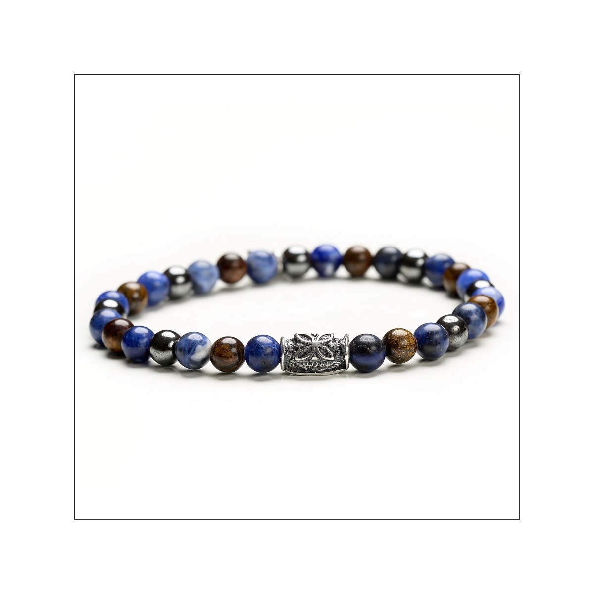 Elastisches Armband aus Sodalit-Steinen, Tigeraugen, Hämatit und Details aus 925er Silber.