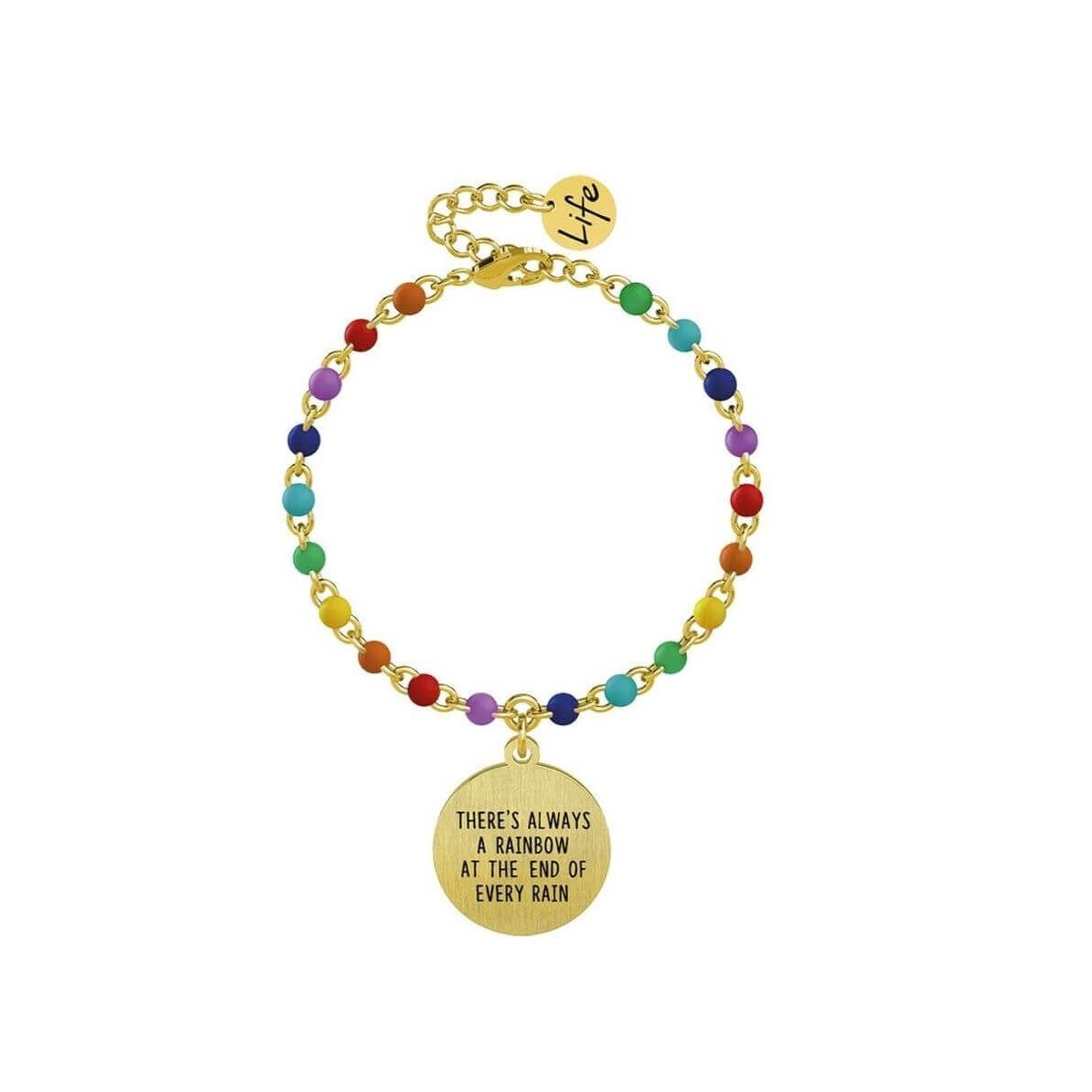 Gelbgoldfarbenes Stahlarmband mit rundem Satinanhänger und Rollokette mit mehrfarbigen Emaileinsätzen.