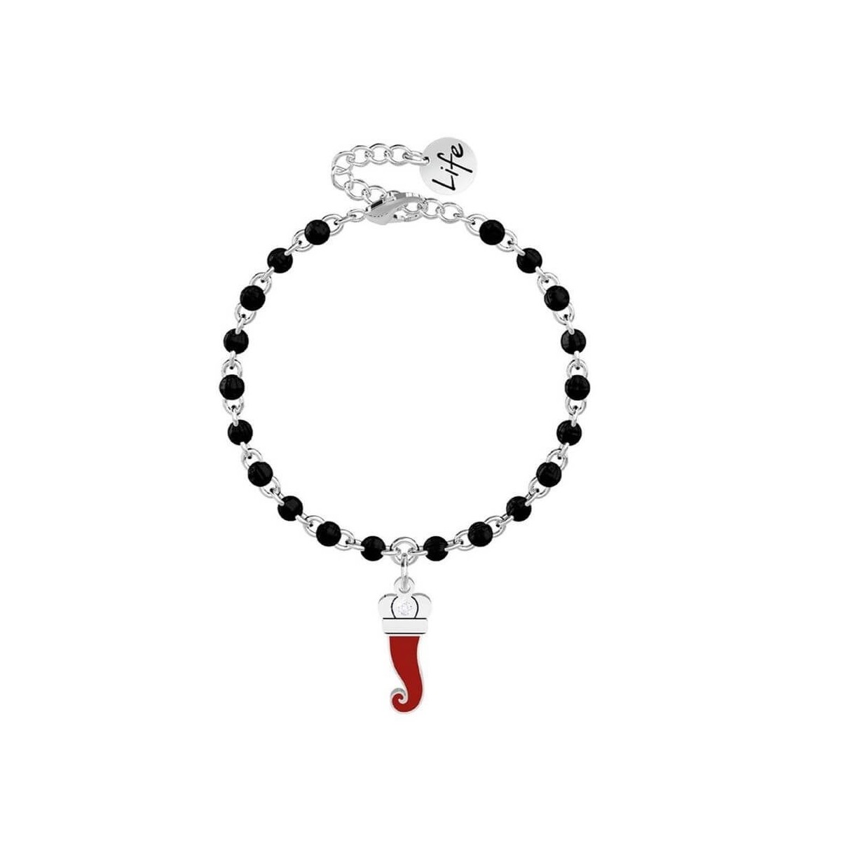 Stahlarmband mit rot emailliertem Hornanhänger und Rollokette mit schwarzen Emaileinsätzen.