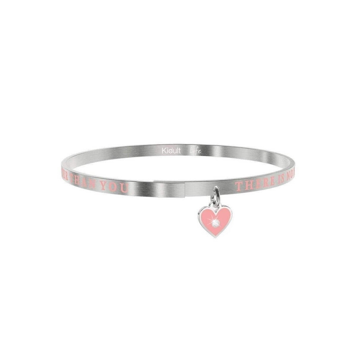 Dünner Armreif aus gebürstetem Stahl mit Schrift und kleinem rosa emailliertem Herzanhänger.
