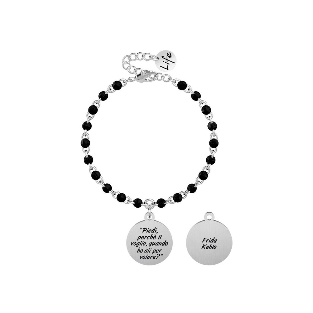 Frida Kahlo Official Collection Stahlarmband mit rundem Satinanhänger und Rollokette mit schwarzen Emaille-Einsätzen.