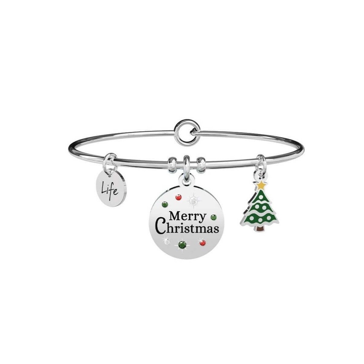 Stahlarmreif mit rundem Anhänger mit farbigen Kristallen und einem Anhänger in Form eines Weihnachtsbaumes mit farbigen Glasuren.
