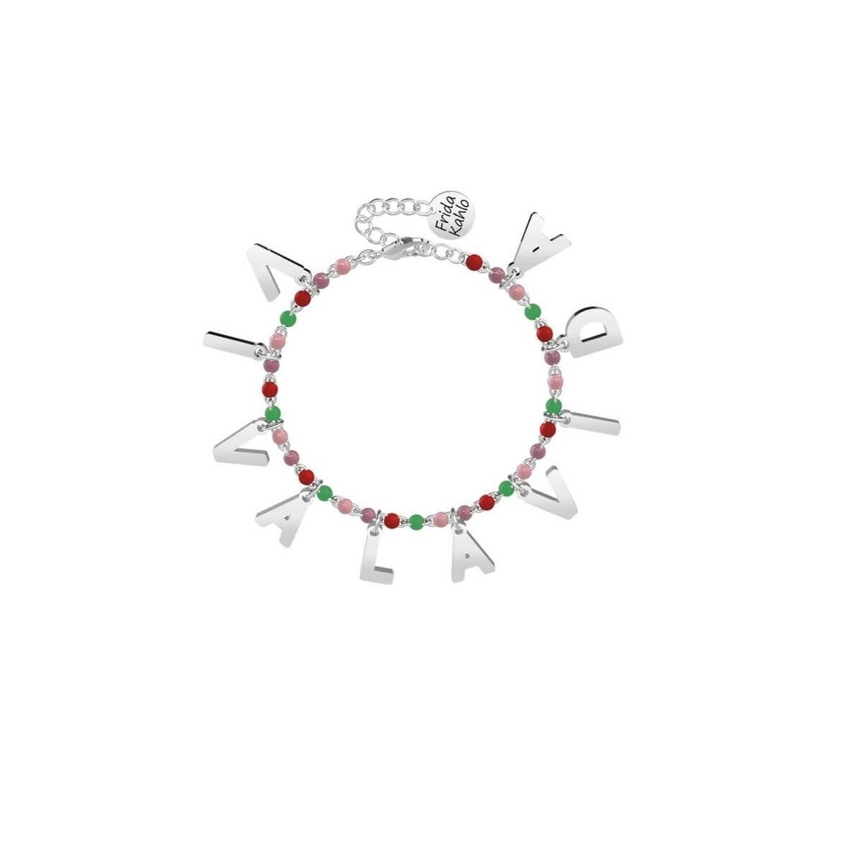 Frida Kahlo Official Collection Stahlarmband mit Viva la vida-Anhängern und Rolò-Kette mit mehrfarbigen Emaille-Einsätzen.