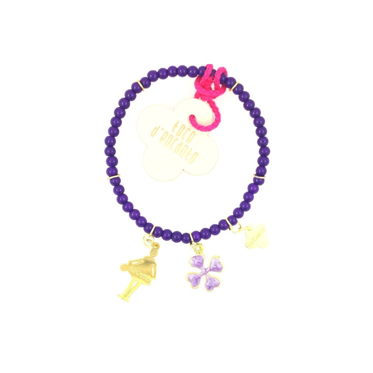 Die Carose von Toco der Lila Perlen Armband Encanto mit Anhänger und schwarzen Emaille-Vierpass-Puppe.