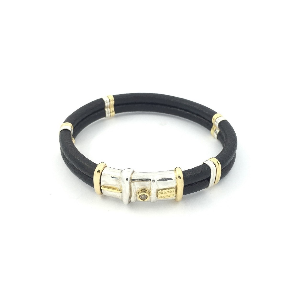 Lederarmband aus 5 mm behandeltem Leder mit Doppelstrang, mit Elementen aus gehämmertem und satiniertem 18KT Gelbgold und Elementen aus 925 Silber.