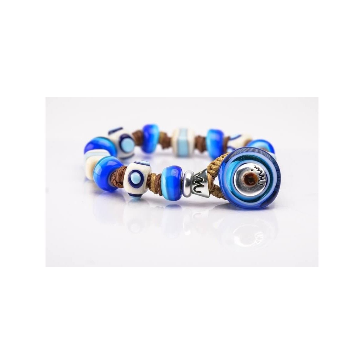 Das Moi Iceblue Armband ist handgefertigt aus Muranoglas und Seil, es zeichnet sich durch die besondere Verarbeitung der Perlen aus.