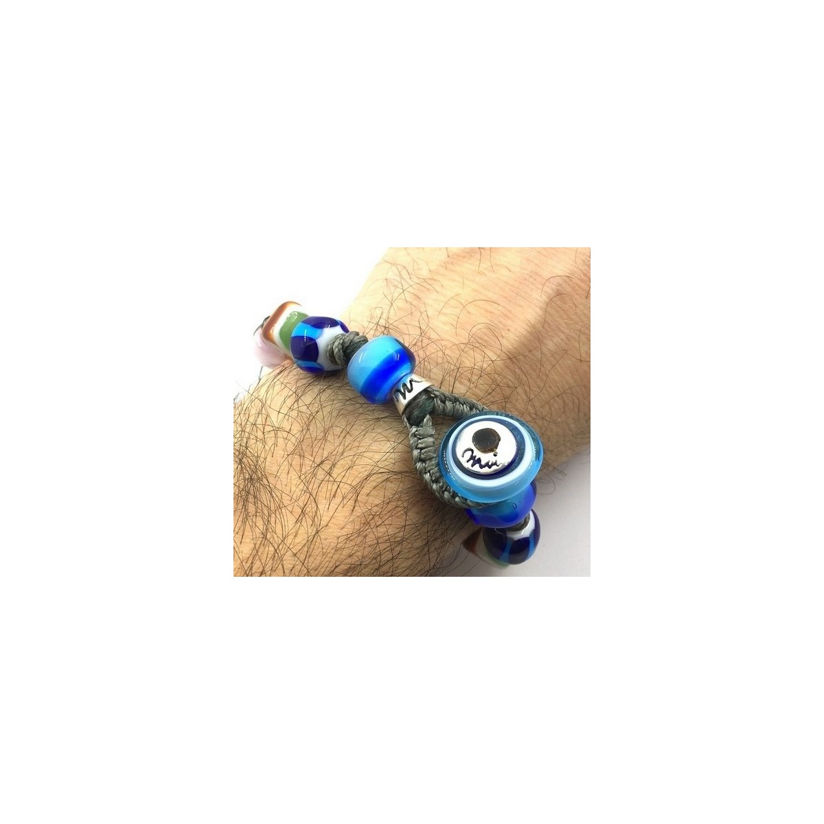 Originales Moi Mann-Frauenarmband mit Stoffcord und Murano-Glasperlen in Blau, Weiß und Weißgold.