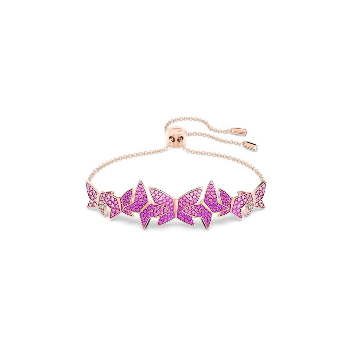 Starres Damenarmband von Swarovski aus der Lilia-Kollektion aus rosévergoldetem Metall mit Schmetterlingen, die mit fuchsiafarbenem Kristallpavè verziert sind, gekennzeichnet durch einen leicht verstellbaren Schiebeverschluss.