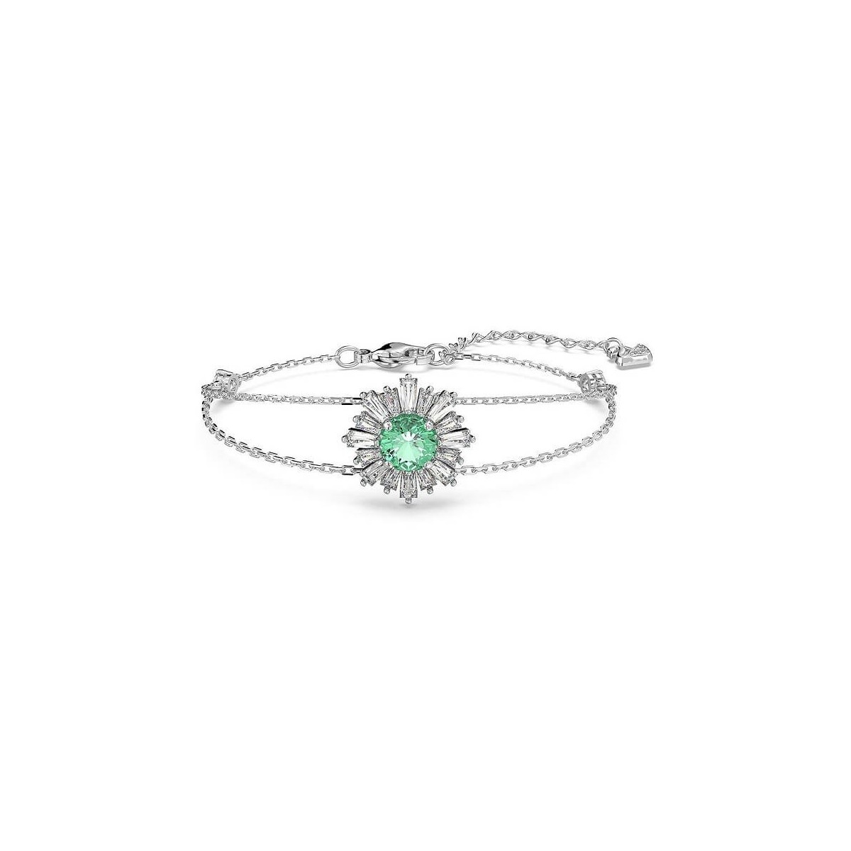 Tragen Sie den Frühling mit diesem Armband aus der neuen Sunshine-Kollektion von Swarovski. Schmuckstück mit elegantem rhodiniertem Rahmen und zentralem Motiv mit grünem Kristall, eingerahmt von kleinen weißen Strahlen.