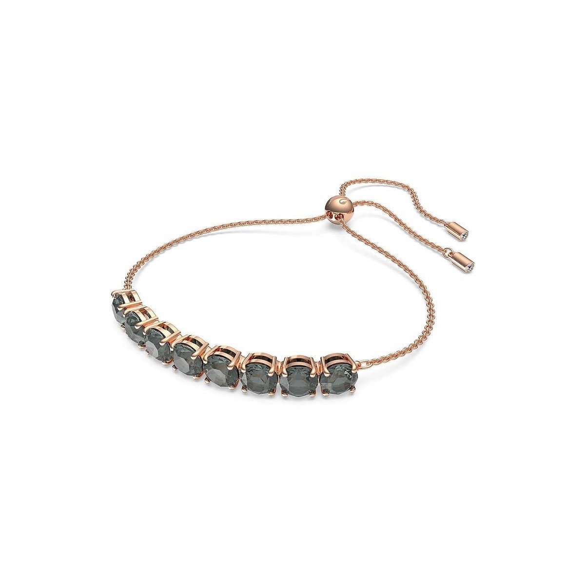 Damenarmband von Swaroski aus der Exalta-Kollektion. Hergestellt aus einer rosévergoldeten Kette mit einer Reihe schwarzer Kristalle und einem verstellbaren Schiebeverschluss.
