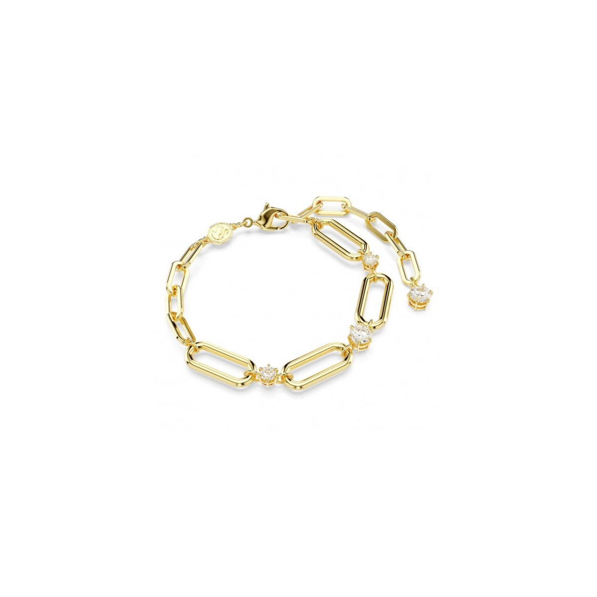 Swarovski-Damenarmband aus der Constella-Kollektion, bestehend aus einer großen Gliederkette im Industriedesign mit raffinierter Gelbgoldbeschichtung und Swarovski-Zirkonia in Krappen zwischen den zentralen Gliedern. Verstellbarer Karabinerverschluss mit einzelnem Swarovski-Zirkonia.