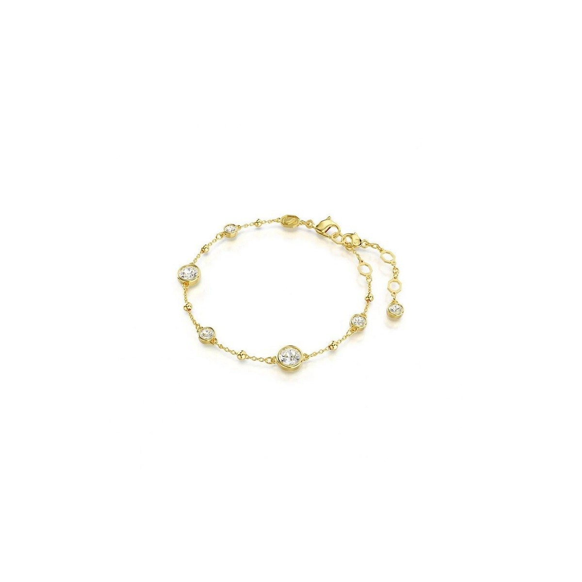 Damenarmband von Swarovski aus der Imber-Kollektion, bestehend aus einer eleganten gelbvergoldeten Metallkette und verziert mit Tropfen aus goldenem Metall und rund geschliffenen Kristallen in einem abgerundeten Rahmen. Verstellbarer Karabinerverschluss mit einzelnem Swarovski-Zirkonia.