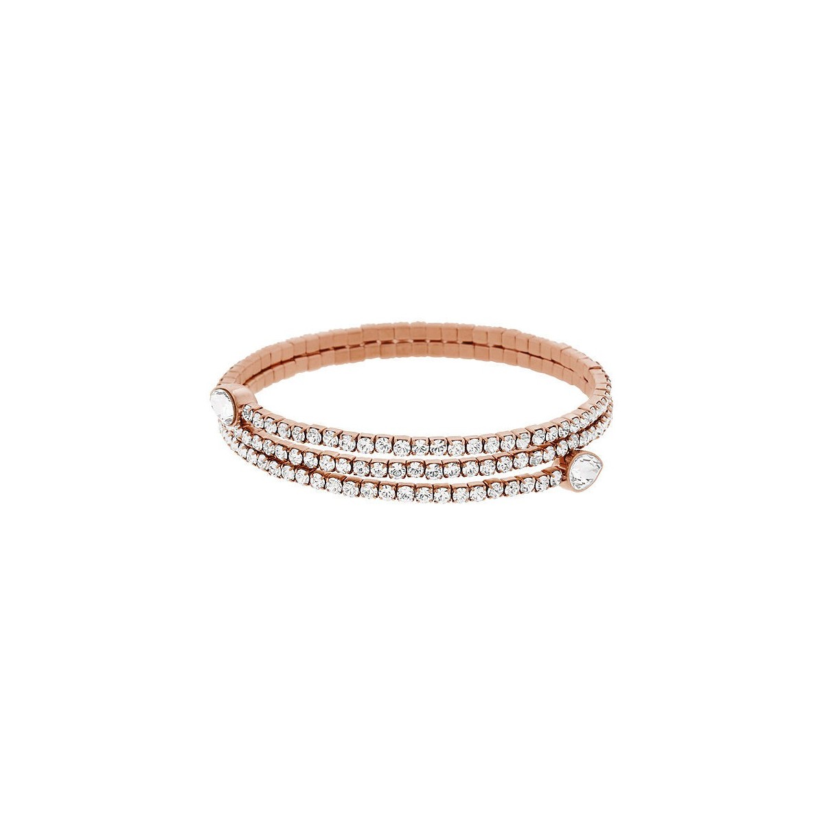 Zeitloses Muster vorgeschlagen durch doppelte Wrap Frühling Armband mit abwechselnden klarem Kristall und rosa vergoldetem Metall, neben die Teardrop-Kristalle an den Enden befestigt. Kombinieren Sie es mit anderen verstärkt für eine trendige Armbänder, weich oder starr.