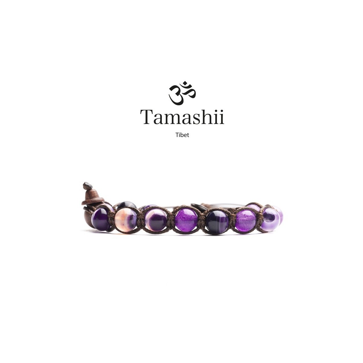 Einteiliges Unisexarmband mit einer Größe (es passt zu jedem Handgelenkdurchmesser) besteht aus gestreiften violetten Achatsteinen, die durch eine gewachste Baumwollschnur verbunden sind. Der violette Achat ist ideal, um sich neuen Herausforderungen zu stellen. Die Streifen verleihen jedem Stein Einzigartigkeit und sind gleichzeitig eine Metapher für die Gleichheit aller Lebewesen.