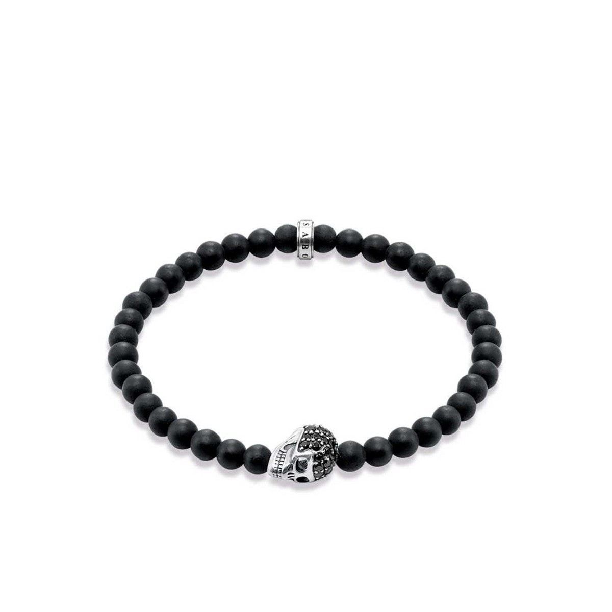 Rebel am Herzen Linie Armband aus schwarzem Obsidian Perlen und 925 Silber Totenkopf-förmigen Komponente und Niello, verziert mit einem funkelnden schwarzen synthetischen Zirkonia ebnen