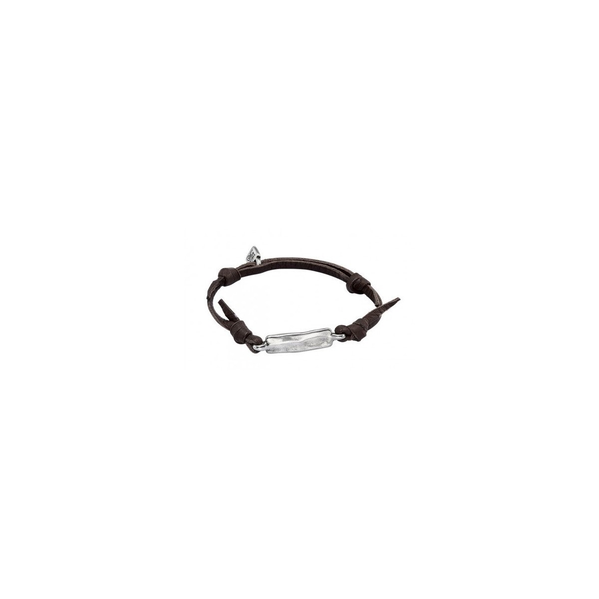 Braun Lederarmband mit einem doppelten Seil und Knoten und Metallteil mit dem Form-Blatt. Kontrast von Silber Metall, leicht unregelmäßig und Kunsthandwerker beenden Merkmal der UNO de 50. UNOde50 Komponente Sperre-Anhänger mit eingravierten Logo. Erstellt in Spanien nach einem Handwerker-Prozess abgeschlossen.