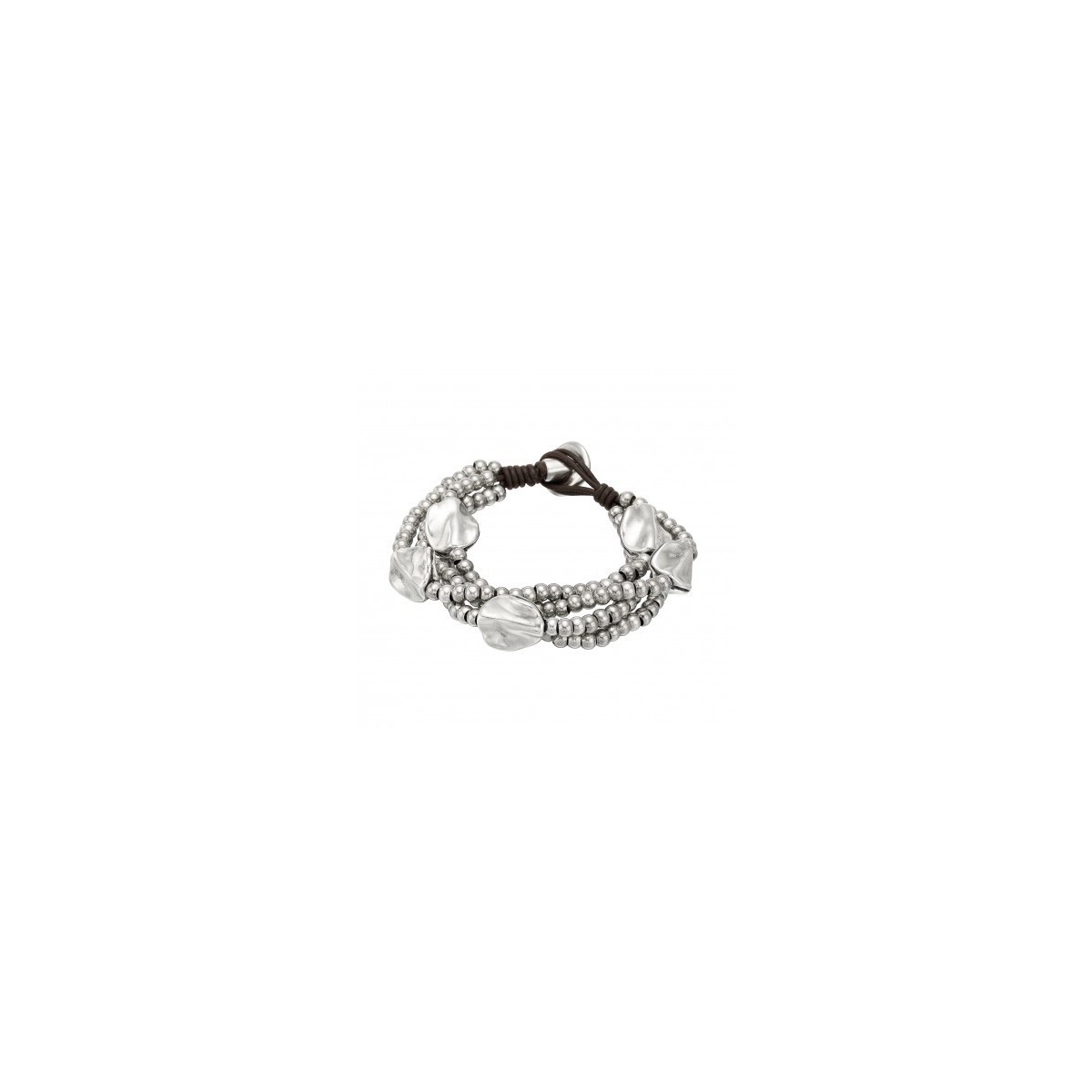 Vierleiter Armband braun Leder bedeckt mit Metall versilbert Silber-Nuggets und zerdrückte Platten aus dem gleichen material