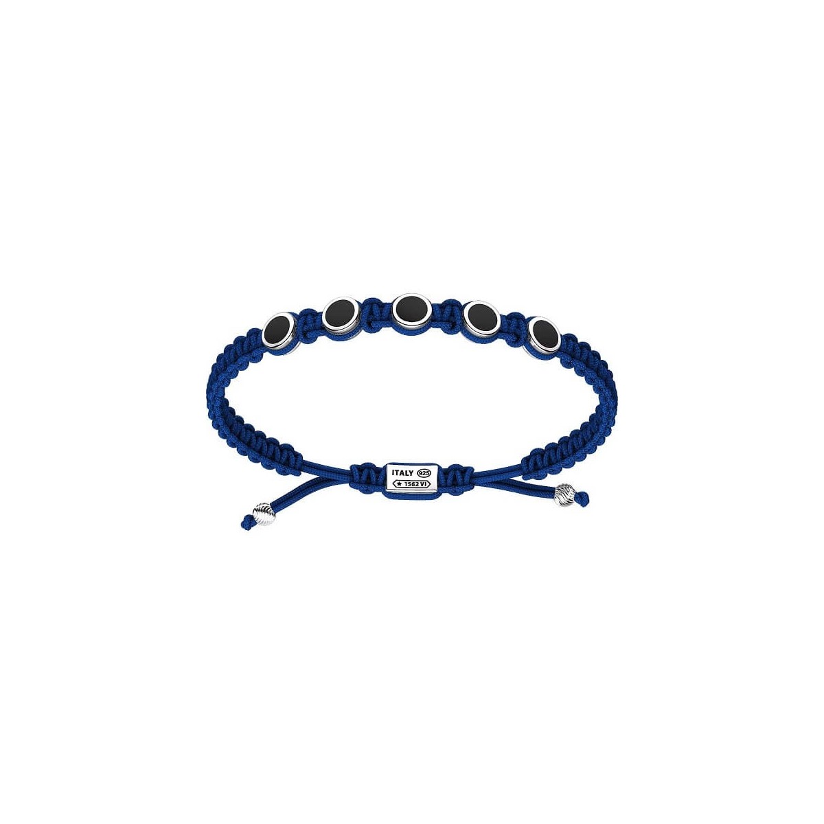 Zancan-Herrenarmband aus der Infinity-Linie aus blauem Stoff, bestehend aus 5,00 g 925er Silber mit blau emaillierten kreisförmigen Details. Verstellbarer Knotenverschluss.