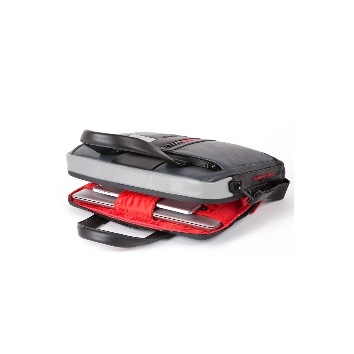 PIQUADRO Schlanke Computer-Aktentasche mit zwei Griffen und iPad®-Halter mit Tasche für CONNEQU aus der Urban-Kollektion aus grauem und schwarzem Leder.