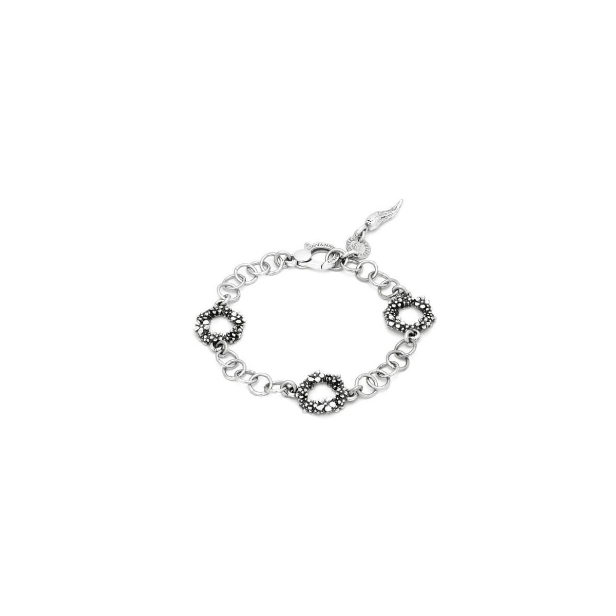 19 m langes Armband, aus der Millefiori-Kollektion, aus 925er Silber, hergestellt mit einer runden Gliederkette, die sich mit drei kreisförmigen Elementen abwechselt, die im Wachsausschmelzverfahren hergestellt und brüniert wurden, hier manifestiert sich das Licht durch die Diamantschlifftechnik, die die winzige silberne Blütenblätter erzeugen einen schimmernden Effekt und kontrastieren mit der polierten Kette und Basis. Karabinerverschluss mit Einstellgliedern.
