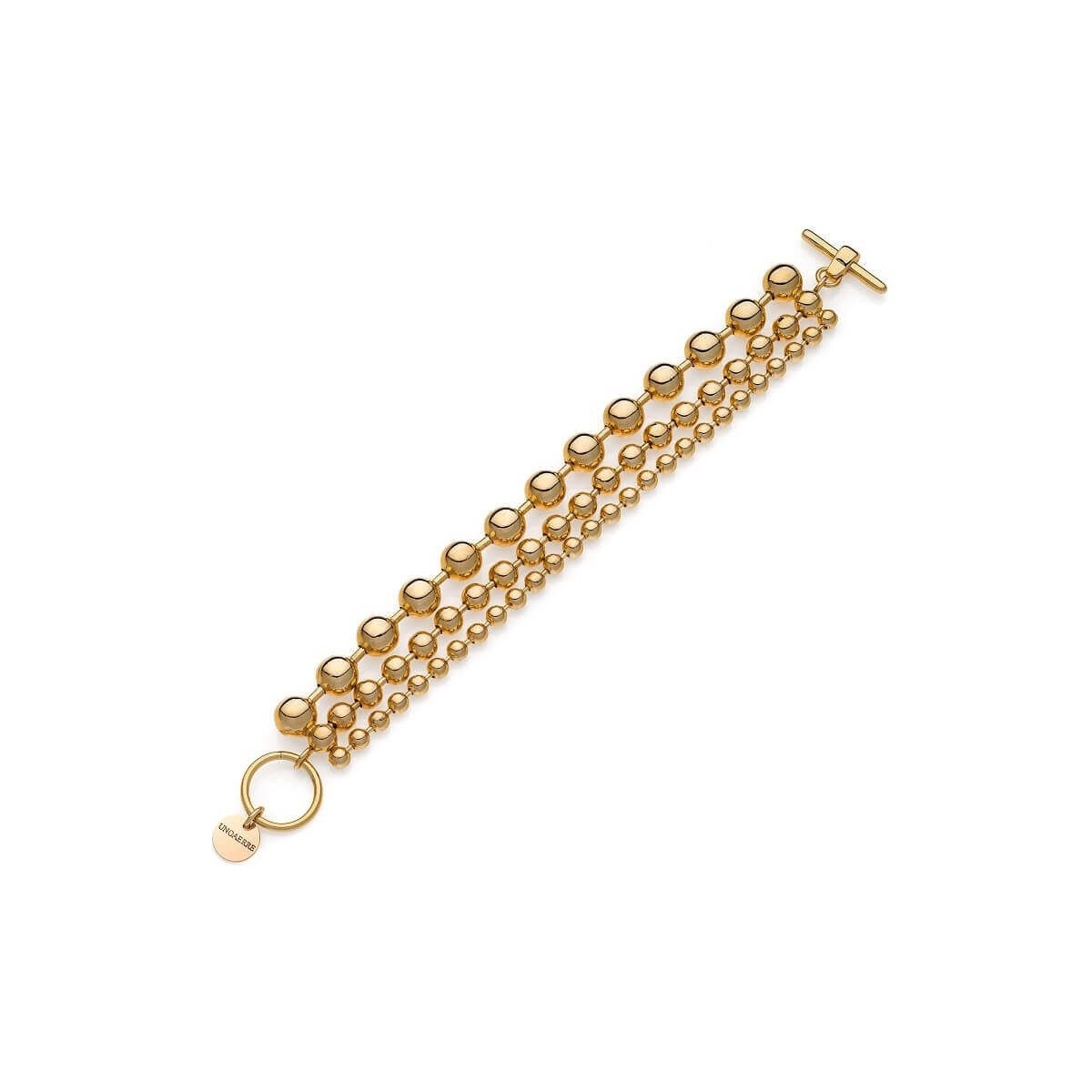 Unoaerre Sphere Damenarmband, 20 cm lang, mit dreireihiger Kugelkette in abgestuften Größen, aus Bronze mit poliertem 24-Karat-Gelbgoldbad, mit Logo-Medaille und T-Bar-Verschluss.