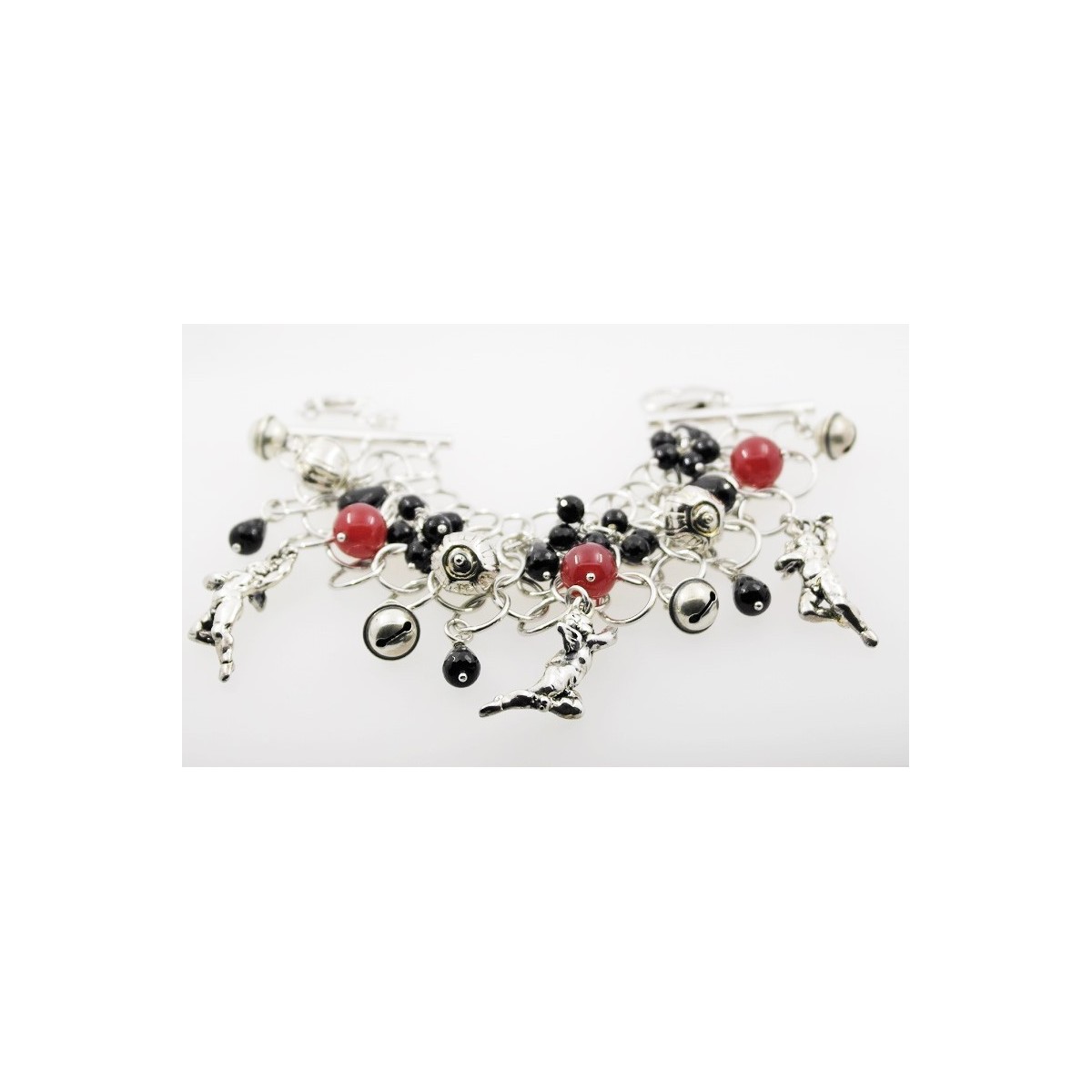 Breites Armband in Silber 925 ‰ Anhänger Engel, Glocken, Bolules, roter Achat und Onyx Black, Terminal mit Kornett.