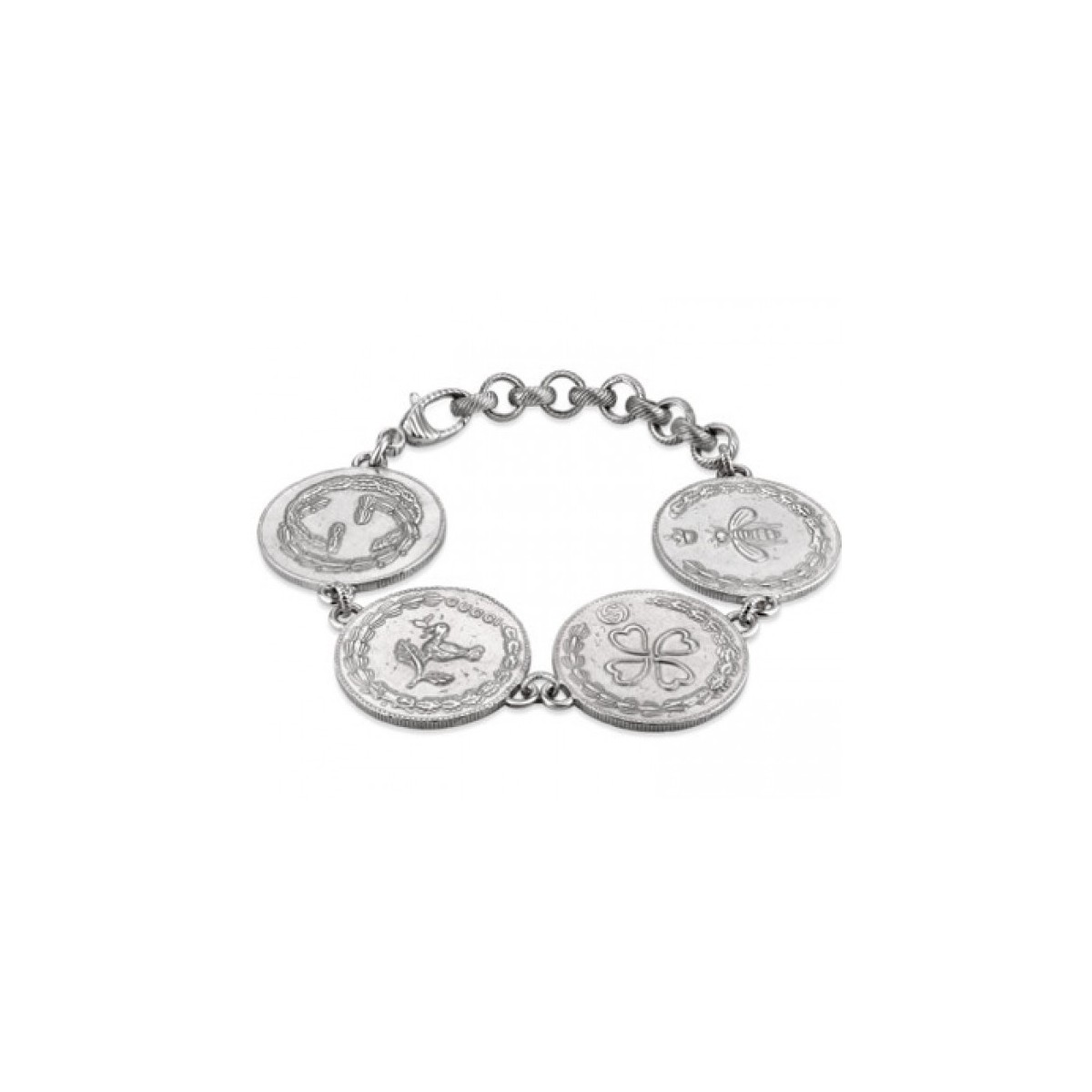 Matt Rhodium plated 925 Silber Armband mit vier großen Münzen verziert mit geprägtem ineinandergreifenden G Biene