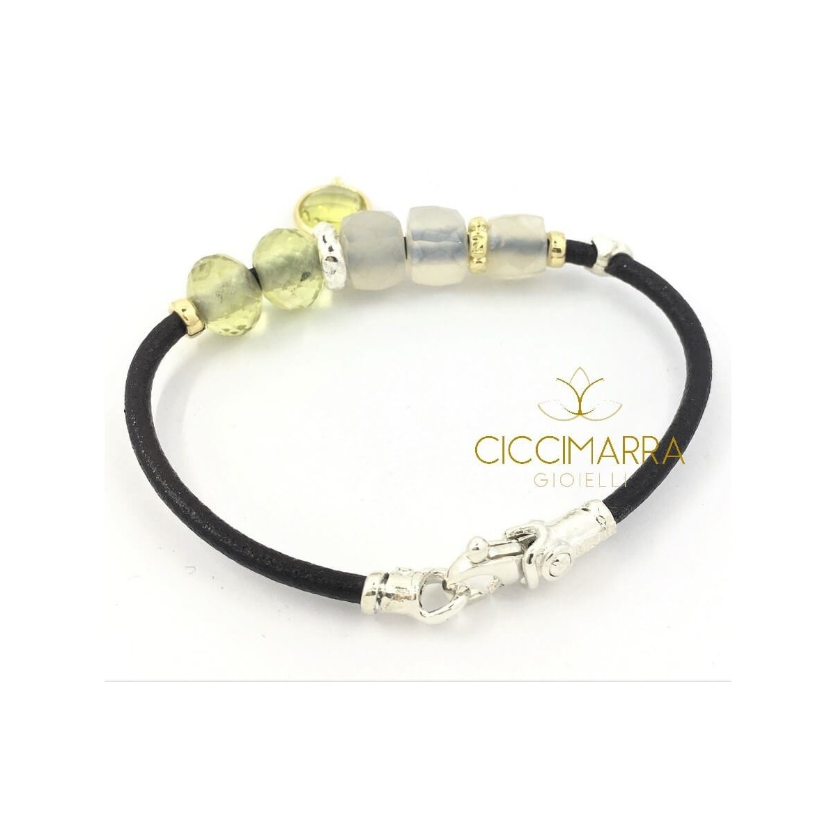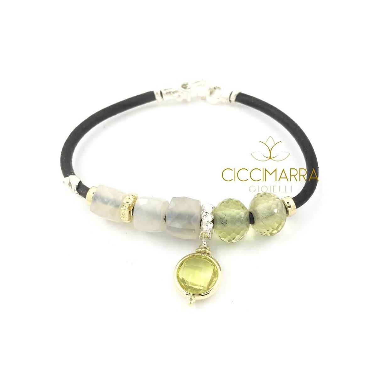 3 mm behandeltes toskanisches Lederarmband mit handgefertigten Elementen aus 18 Karat Gelbgold und 925 Silber, die die beiden Perlen und den facettierten Zitronenquarz-Anhänger sowie die drei facettierten Mondsteine verschönern.