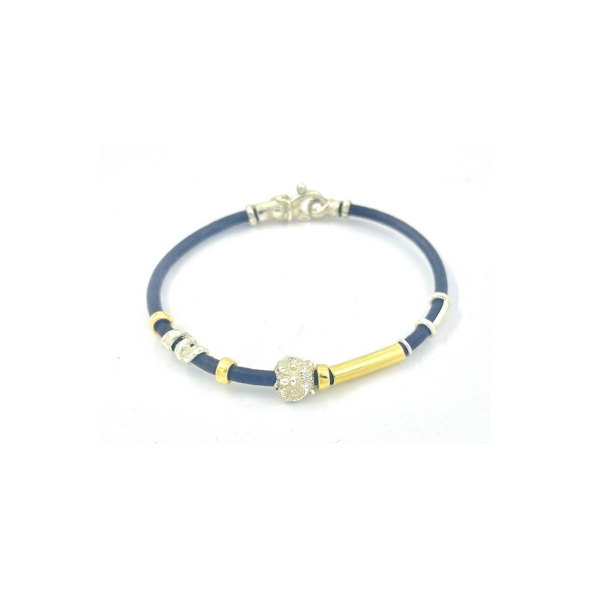 Armband aus der Accenti Misani Milano Kollektion mit 3 mm toskanischem Lederfaden, Karabinerverschluss und handgefertigten Elementen aus 18 kt Gold und 925 Silber