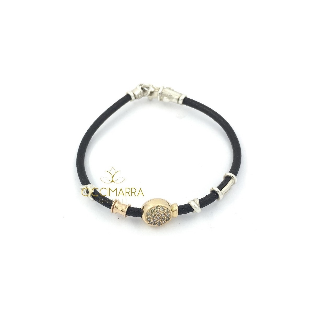 Bracelet Frau Toyama Bay Misani Kollektion mit 3 mm toskanischem Ledergarn, Karabinerverschluss, handgearbeiteten Elementen in 18 Karat Gold, Silber und Diamanten