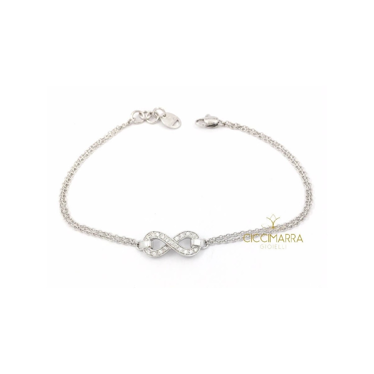 Armband aus 18 Karat Weißgold mit acht zentralen stilisierten Unendlichkeiten mit Brillanten und doppelter Kette mit Haken, auf die ein Diamant gesetzt und mit dem Salvini-Logo graviert ist