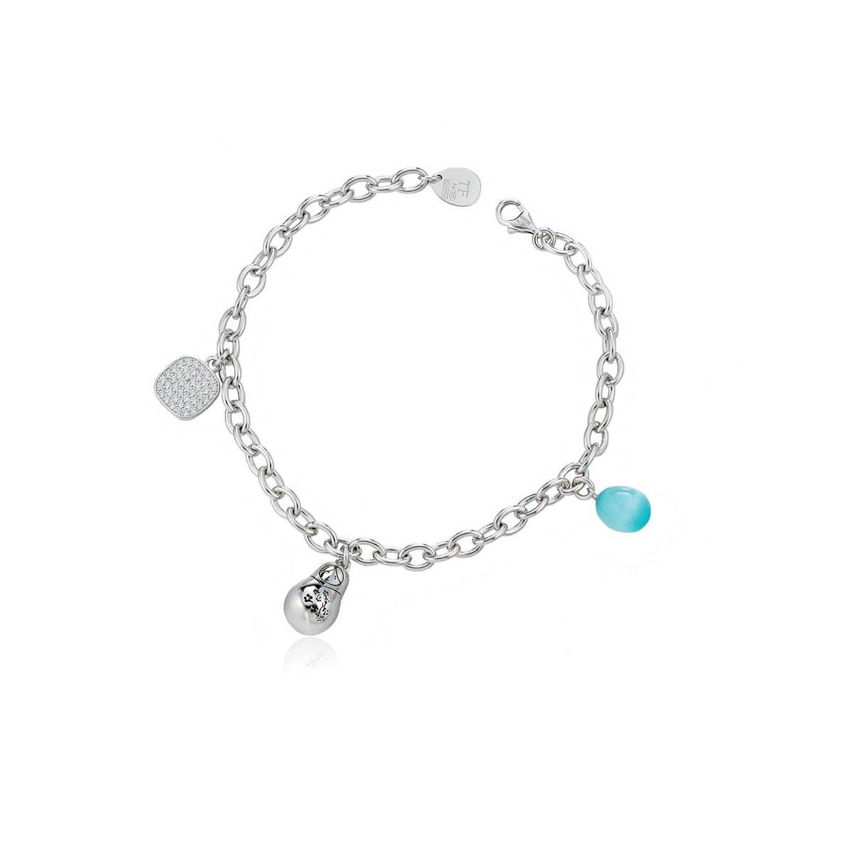 Olga Collection Armband aus 925er Silber mit hellblauem Ei, Matroschka und quadratischem Anhänger mit weißem Pavé - OLP02293W