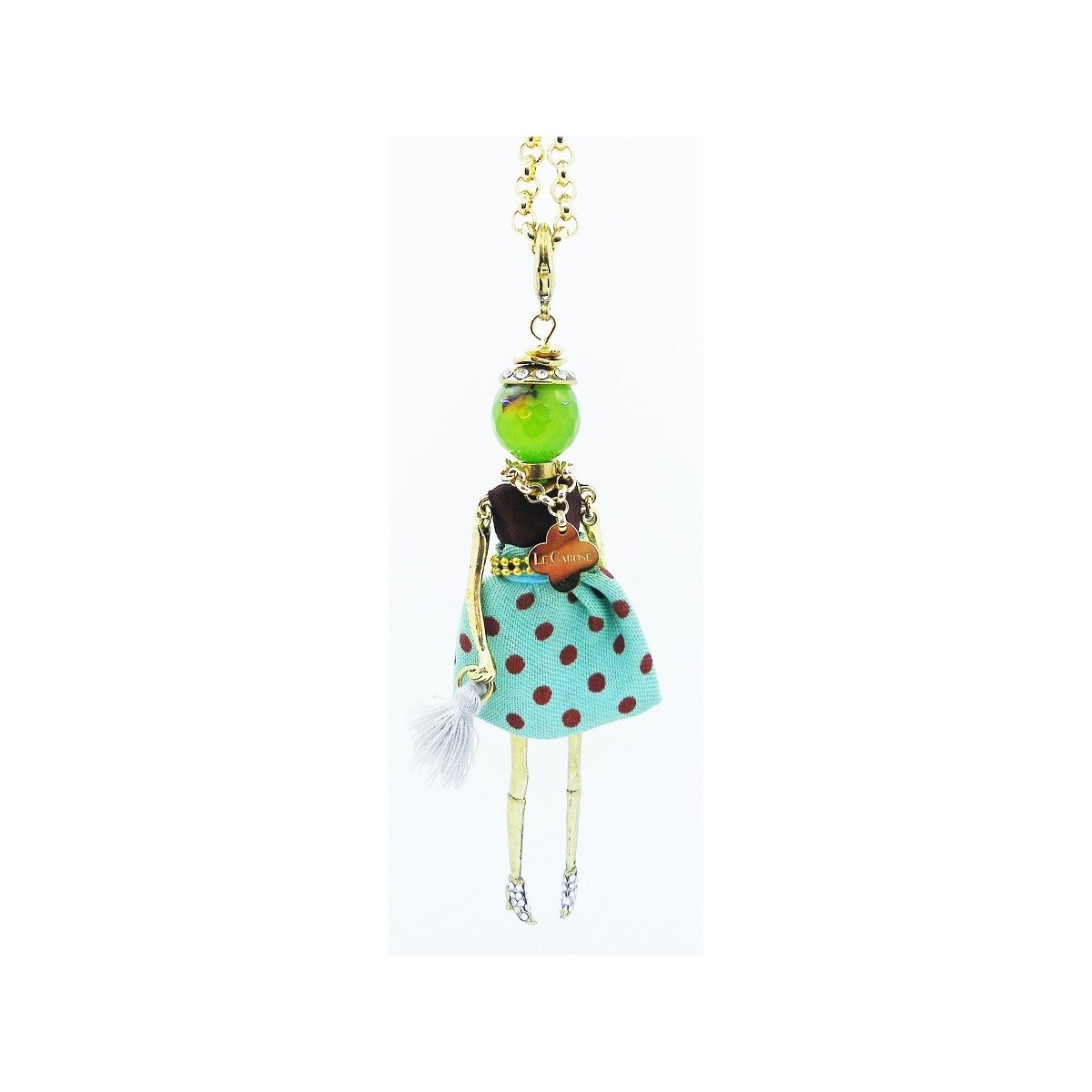 Die Carose von Todo des Encanto Goldene Halskette Chanel lange Pearl Anhänger mit synthetischen Puppe Kopf und siehe; Polka Dot Kleid Türkis und Burgund mit Swarovski Schuhe details