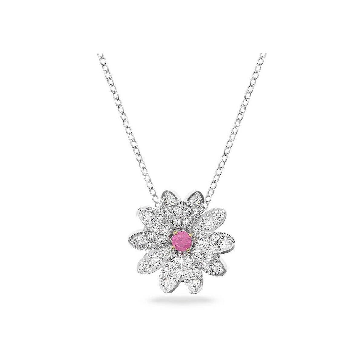 Swarovski Girogola Damenhalskette aus der Eteranal Flower Kollektion. Die Halskette ist auf einem mit einer Mischung aus Metallen plattierten Rahmen gefertigt, das Schmuckstück ist von der Schönheit von Gänseblümchen inspiriert, indem es einen Blumenanhänger mit einem zentralen rosa Stein vorschlägt, der mit Blütenblättern aus brillanten transparenten Steinen angereichert ist.
