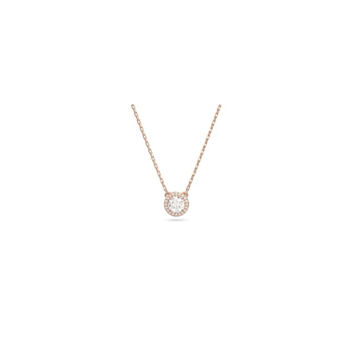 Damenhalskette, Constella-Linie, mit zentralem weißem Kristallanhänger und Pavé-Krone auf Roségold-Plattierung. Maximale Länge: 42 cm